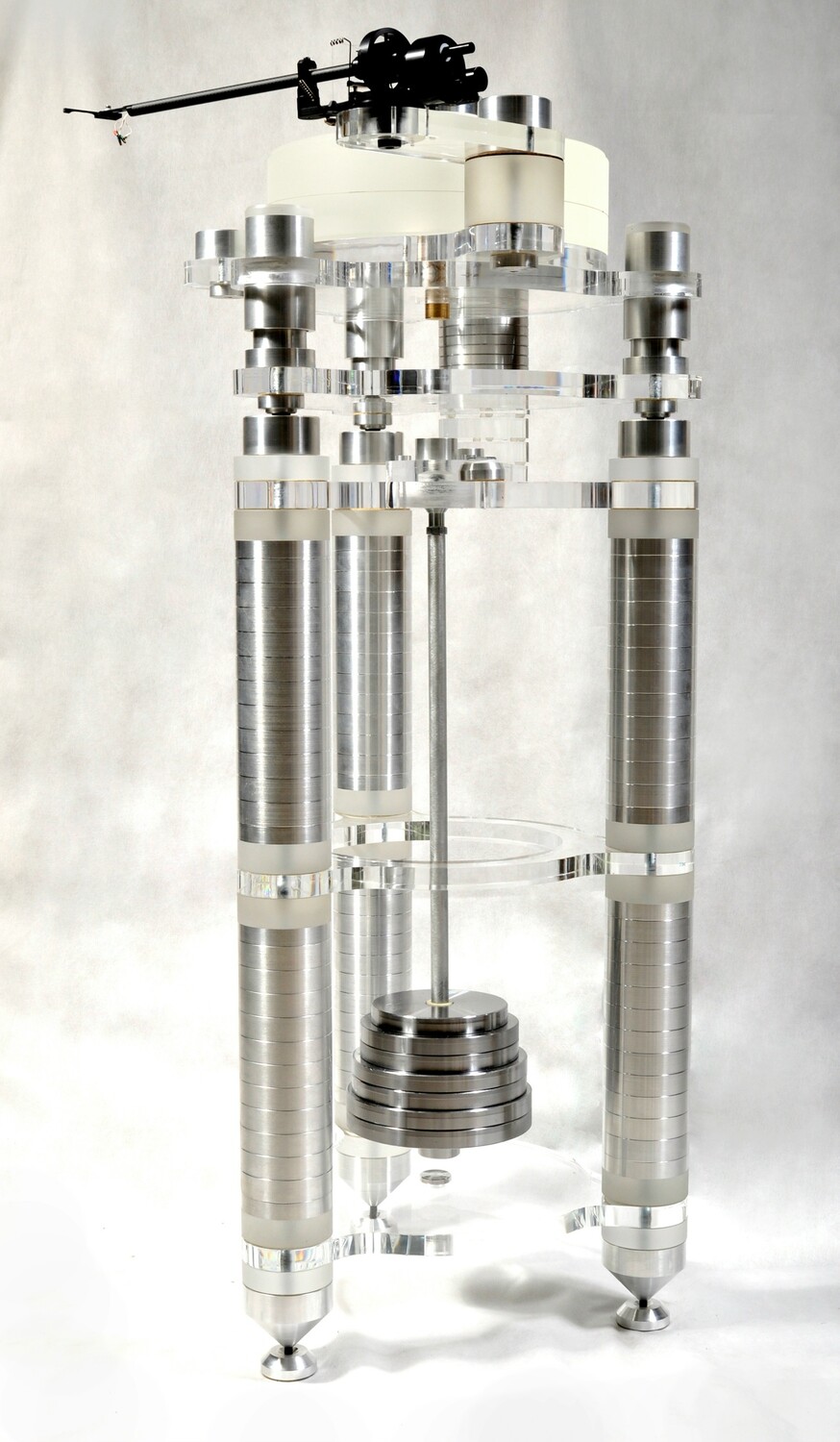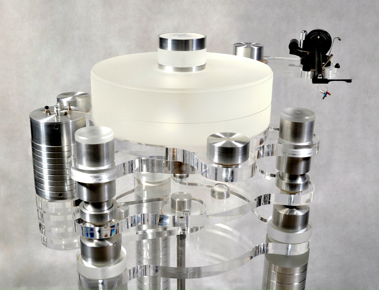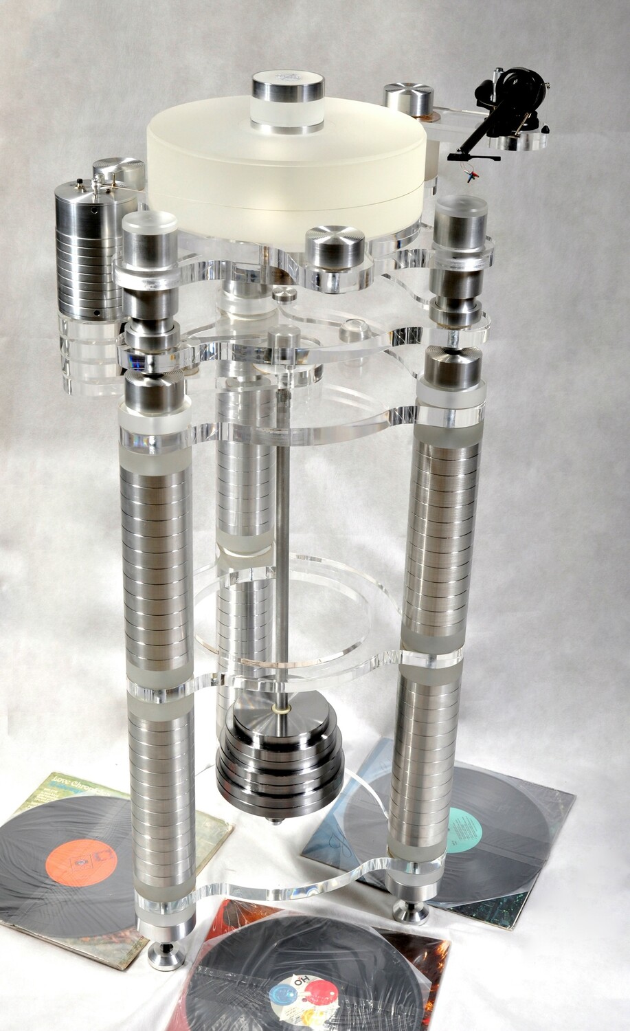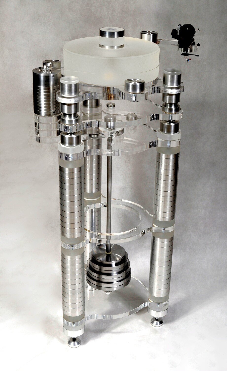 Двигатель размещен в отдельном корпусе со столом проигрывателя, развязан 3 уровнями гашения вибрации и напрямую не сообщается, что исключает передачу вибраций. У каждой из трех опор предусмотрена возможность плавной регулировки.